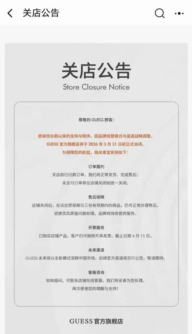 潮流品牌GUESS近日发布公告,其线上旗舰店将于3月31日前正式关闭。公告指出,此次关店源于品牌对经营模式与渠道战略的全面调整。在2026年3月31日前,所有已支付订单将照常发货并完成售后流程;尚未付款的订单则会在店铺关闭前统一取消。店铺停止运营后,在法定质保期与“三包”有效期内的商品,消费者仍可正常申请售后服务,包括退换货及质量问题处理,品牌将持续提供支持。GUESS表示,未来将以全新的模式深耕中国市场。