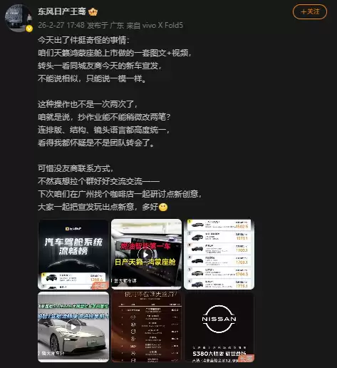 2月28日消息,东风日产汽车销售有限公司新能源品牌总经理王骞 27 日晚在微博发声,直指同城汽车品牌新车宣发内容与天籁鸿蒙座舱上市的图文、视频宣发物料高度雷同,“不能说相似,只能说一模一样”。他表示