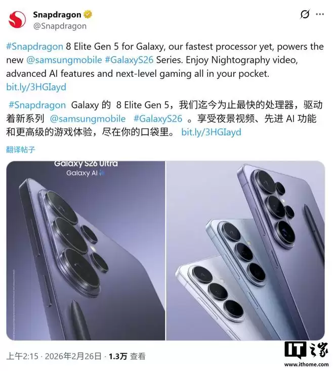 IT之家2月26日消息,高通公司今日正式发布公告,确认将在三星Galaxy S26系列手机发布会上推出其迄今为止性能最强的移动平台——第五代骁龙8至尊版定制芯片(Snapdragon 8 Elite Gen 5 for Galaxy)。