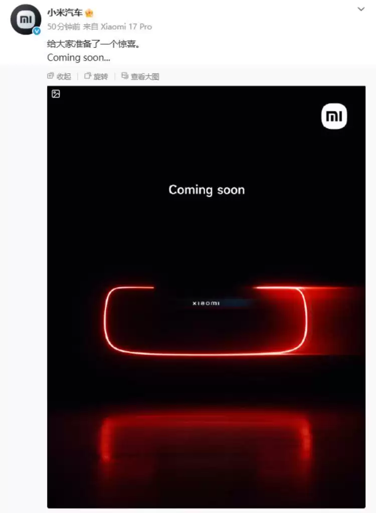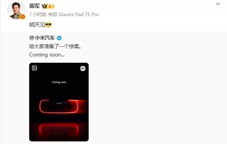 小米汽车近期的频频动作,引发了市场的高度关注。先是小米汽车官方最新发布了一则神秘预告,上面写着:“给大家准备了一个惊喜。Coming soon…...”随后雷军转发并简短留言“明天见”,这番互动迅速点燃了网友们的好奇心。