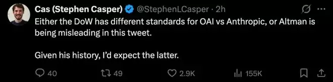 也有网友质疑,要么是五角大楼对 OpenAI 和 Anthropic 采用了不同的标准,要么就是奥特曼在这条推文中故意误导大家。鉴于他过往的历史记录,我更倾向于后者。