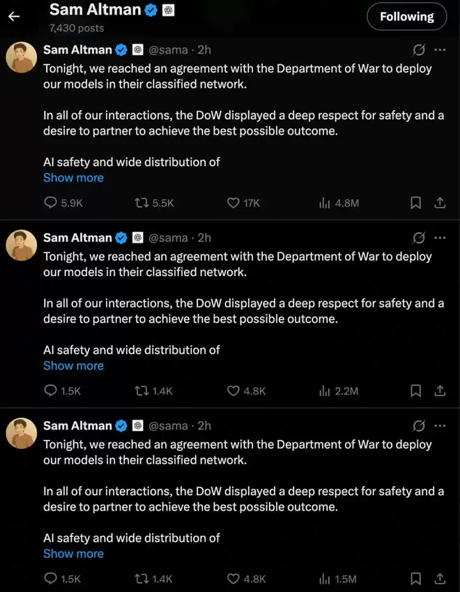 可刚刚,奥特曼在 X 上连发三条相同的帖子,宣布OpenAI 已与美国五角大楼达成协议,将模型部署到他们的机密网络中