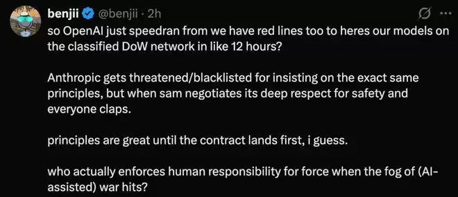 有人讽刺:所以 OpenAI 就这么在差不多 12 小时内,从「我们也有红线」快速转变成「我们的模型已经部署在物价大楼的机密网络上了」?…… 原则固然重要,但最终还是要等到合同敲定才行。话说回来,真到了 AI 辅助的战争迷雾中,谁来真正强制执行「人类对武力负责」这条?