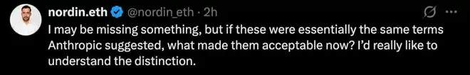 还有网友追问,「如果这些条款本质上和 Anthropic 之前提出的差不多,那现在为什么就变得可以接受了呢?我真的很想搞清楚其中的区别到底在哪里。」