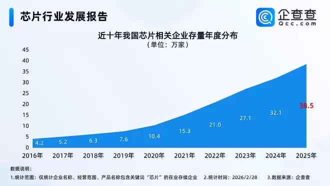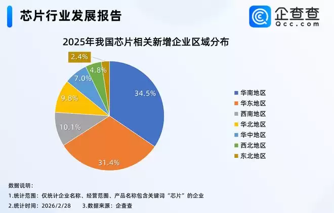 企业调查数据显示,近十年来,我国芯片相关企业的年注册量基本保持逐年增长态势。2025年全年,国内新注册的芯片相关企业达到8.69万家,创下近十年新高。从地域分布来看,2025年新注册企业中,华南地区数量最多,占总量的34.5%;华东地区紧随其后,占比为31.4%。截至2026年2月28日,我国现存芯片相关企业共计39.3万家。