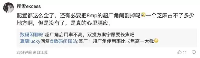 后续有用户在评论区表示:“配置都这么全了,还有必要把 8mp 的超广角阉割掉吗?一个芝麻占不了多少地方啊,但是没有了,是真的心里膈应。”博主回复道:“超广角启用率不高,双摄方案宁愿要长焦吧”。
