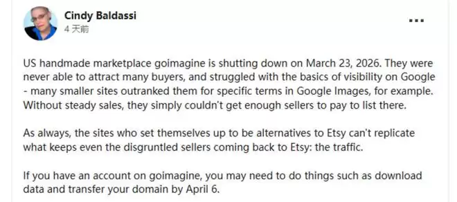2026年的跨境圈,小众电商平台的“关停潮”仍在持续。近期美国手工制品交易平台Goimagine发布公告, 及所有子站将于2026年3月23日全面下线,卖家后台则将在4月6日关闭。
