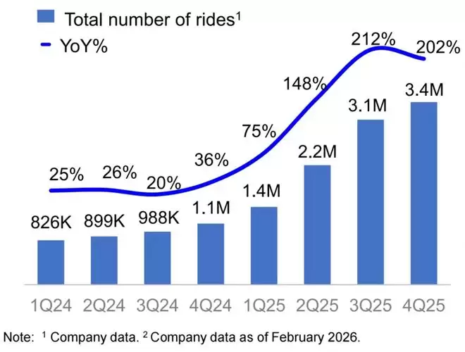 作为物理AI落地的典范,萝卜快跑在2025年迎来爆发。第四季度,萝卜快跑提供全无人驾驶出行服务340万单,同比增长超过200%;截至2026年2月,累计订单量突破2000万单。
