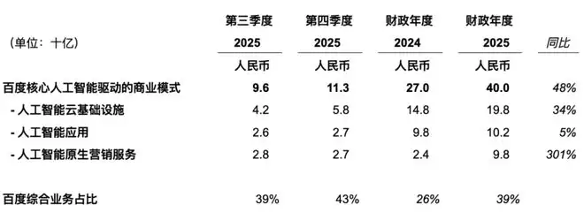 自2025年四季度起,百度将百度核心重新定义为百度一般业务。至此,在财报体现上,百度一般业务包括百度核心AI新业务(智能云基础设施、AI应用及AI原生营销服务)、传统业务(搜索及信息流广告)及其他。