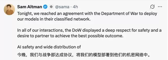 北京时间2月28日,OpenAI CEO 山姆·奥尔特曼(Sam Altman)发文称:OpenAI与美国战争部(“Department of War”,该称呼源自特朗普时代的一项行政命令)达成协议