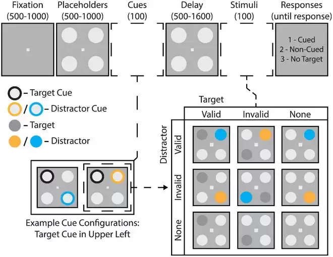 实验招募了 40 名参与者,研究人员要求他们盯着计算机屏幕中央的一个暗灰色方块,保持视线固定,屏幕两侧则会出现空间提示(线索),以 70% 的有效性,指示接下来可能出现的目标(低对比度灰色圆盘)和干扰物(高对比度彩色圆盘)的位置。刺激出现后,参与者需要报告是否在提示目标位置看到目标、非提示位置看到目标或未看到目标。