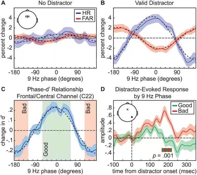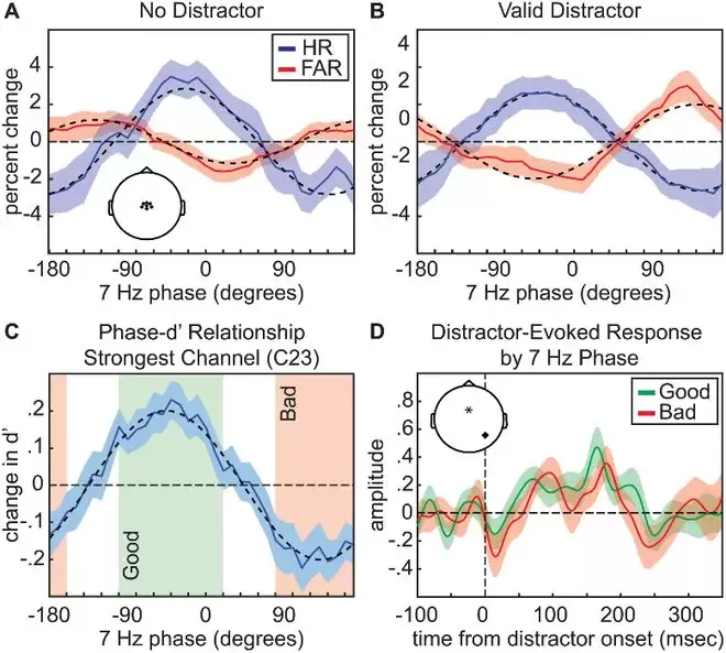 第一种是约 7 Hz 的 Theta 波,这决定了你何时“最容易走神”。研究发现,无论视野中是否存在干扰物,参与者对目标的感知灵敏度都会随着中央电极记录到的 Theta 波段的相位发生周期性波动。