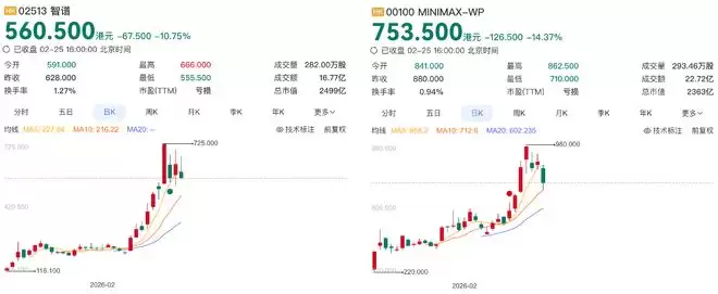 截至今日收盘,智谱的股价为560.5港元/股,总市值2499亿港元;MiniMax的股价为753.5港元/股,总市值2363亿港元。