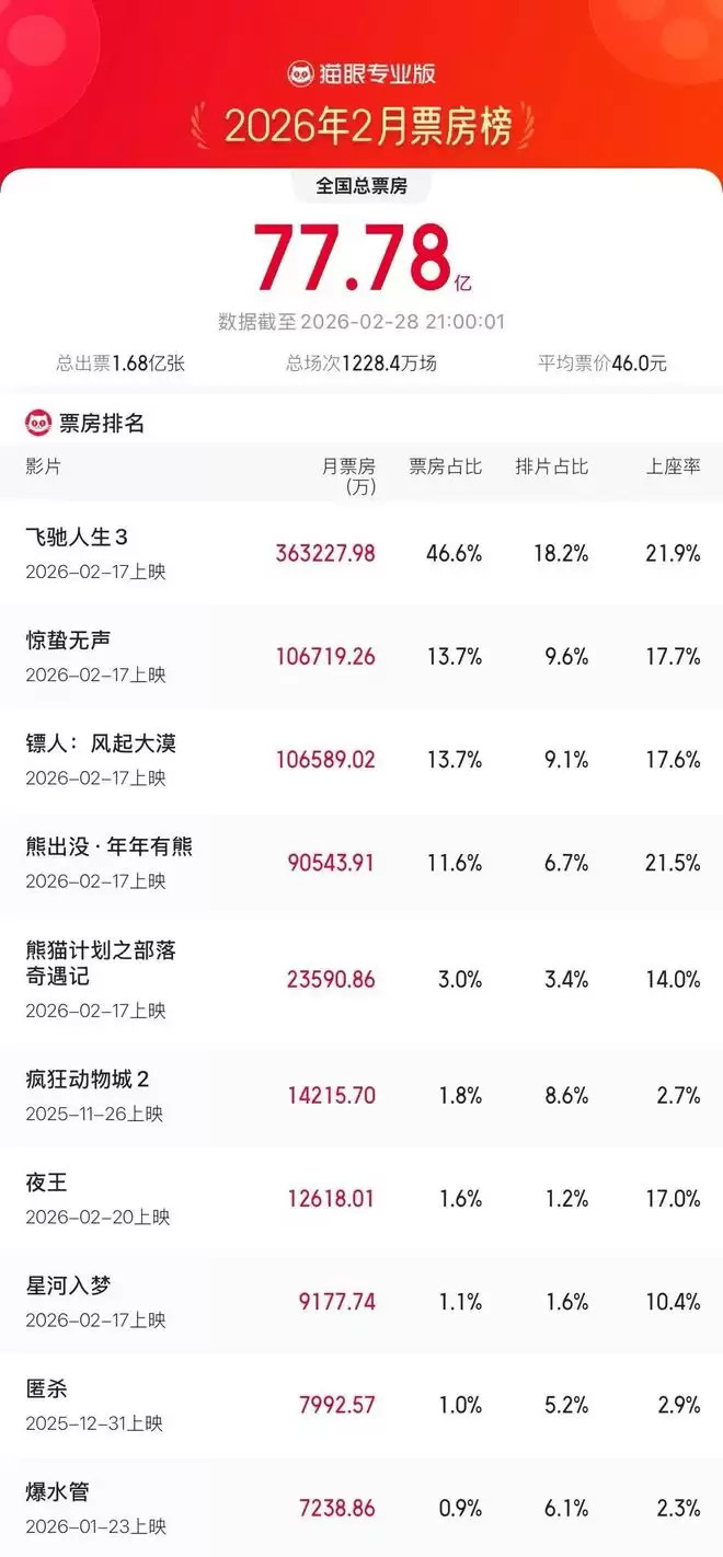 根据猫眼专业版统计数据显示,截至2月28日21时,2026年2月总票房达到77.78亿元。《飞驰人生3》摘得当月票房桂冠,《惊蛰无声》与《镖人:风起大漠》分别位列第二、三名。