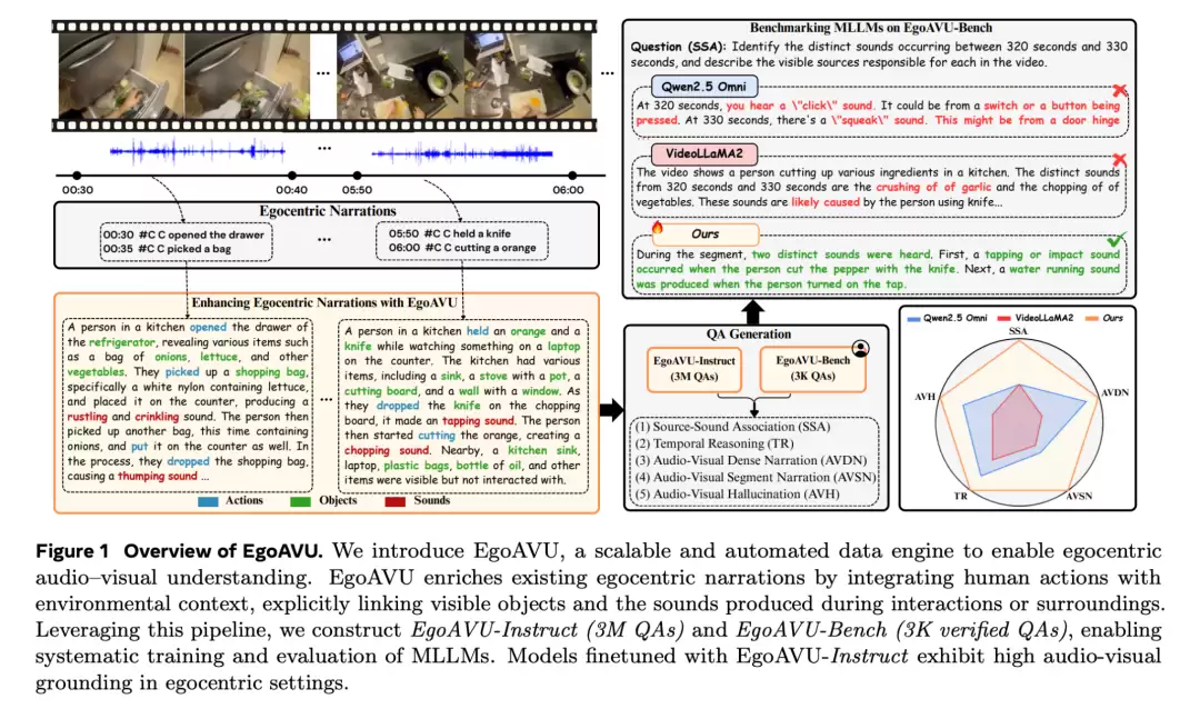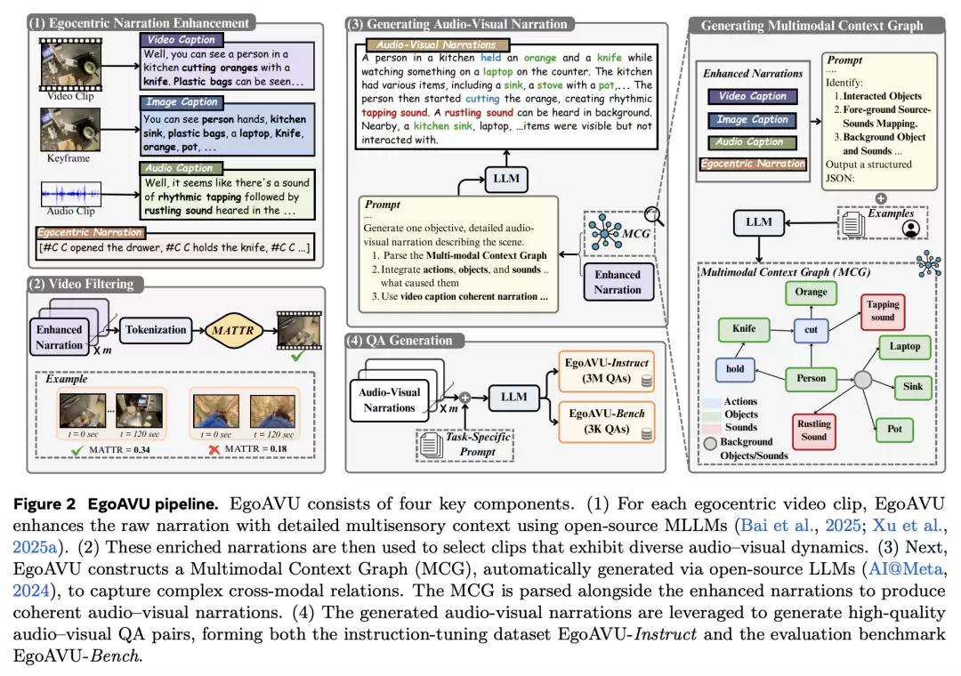 EgoAVU是一个完整的数据生产系统,可以自动理解视频中的声音-视觉关系、自动生成高质量问答与叙述数据、自动筛选最具跨模态信息的视频,最终形成了可规模化扩展的数据流水线。