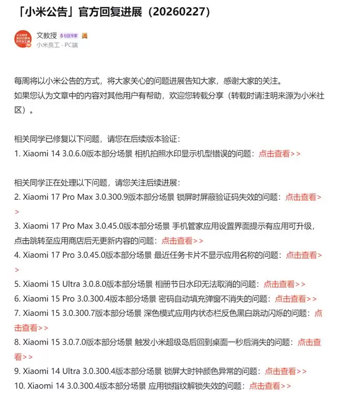 还有Xiaomi 14 Ultra锁屏大时钟颜色异常,Xiaomi 14应用锁指纹解锁失效,连两代前的旗舰也还在维护范围内。