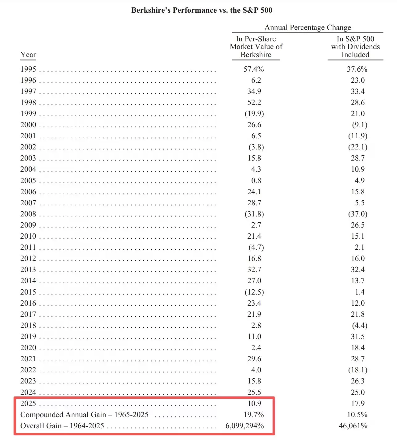 格隆汇2月28日|伯克希尔哈撒韦于周六晚间披露业绩,2025年,伯克希尔每股市值的增幅为10.9%,标普500指数为增长17.9个百分点。长期来看,1965-2025年,伯克希尔每股市值的复合年增长率为19.7%,明显超过标普500指数的10.5%。而1964-2025年伯克希尔的市值增长率是令人吃惊的6,099,294%+,也就是60992倍,而标普500指数为46,061%,仅为460倍。