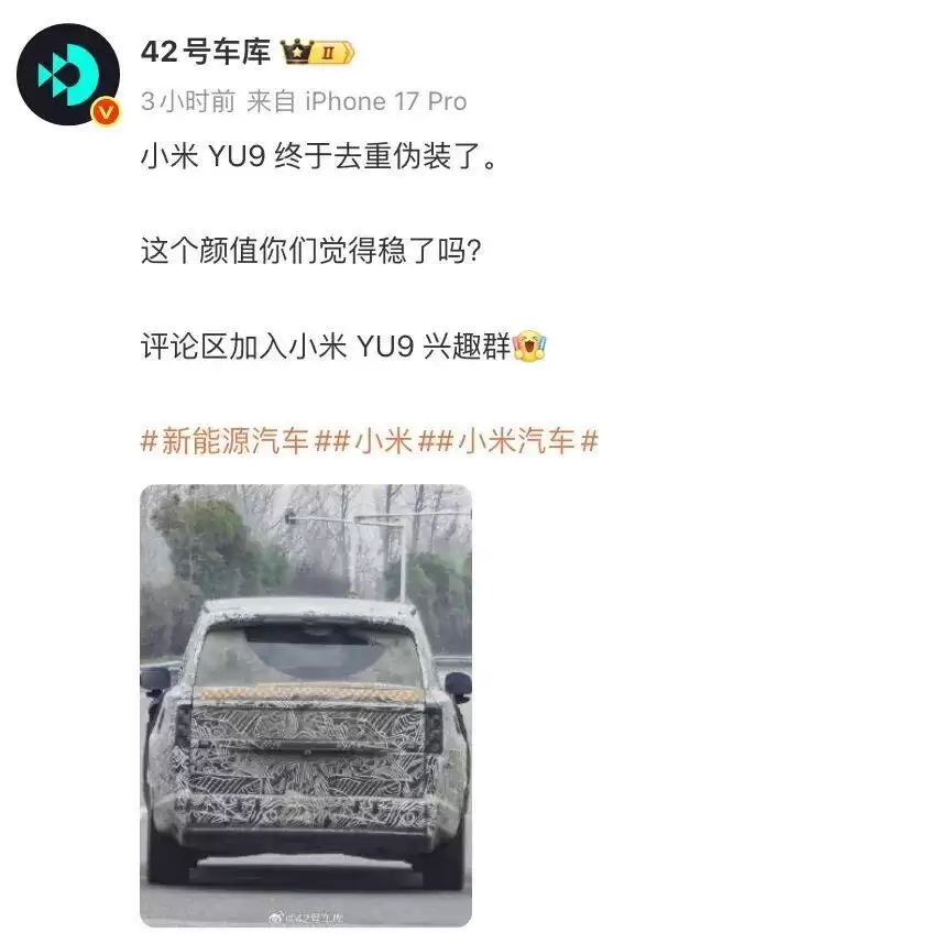 除了SU7,小米汽车另一款新车型也备受关注。博主@42号车库曝光了小米YU9的轻度伪装实车照片。据透露,该车型内部代号为“昆仑”,定位在30-50万元级别的大六座/七座增程式SUV,预计将进一步丰富小米汽车的产品线布局。