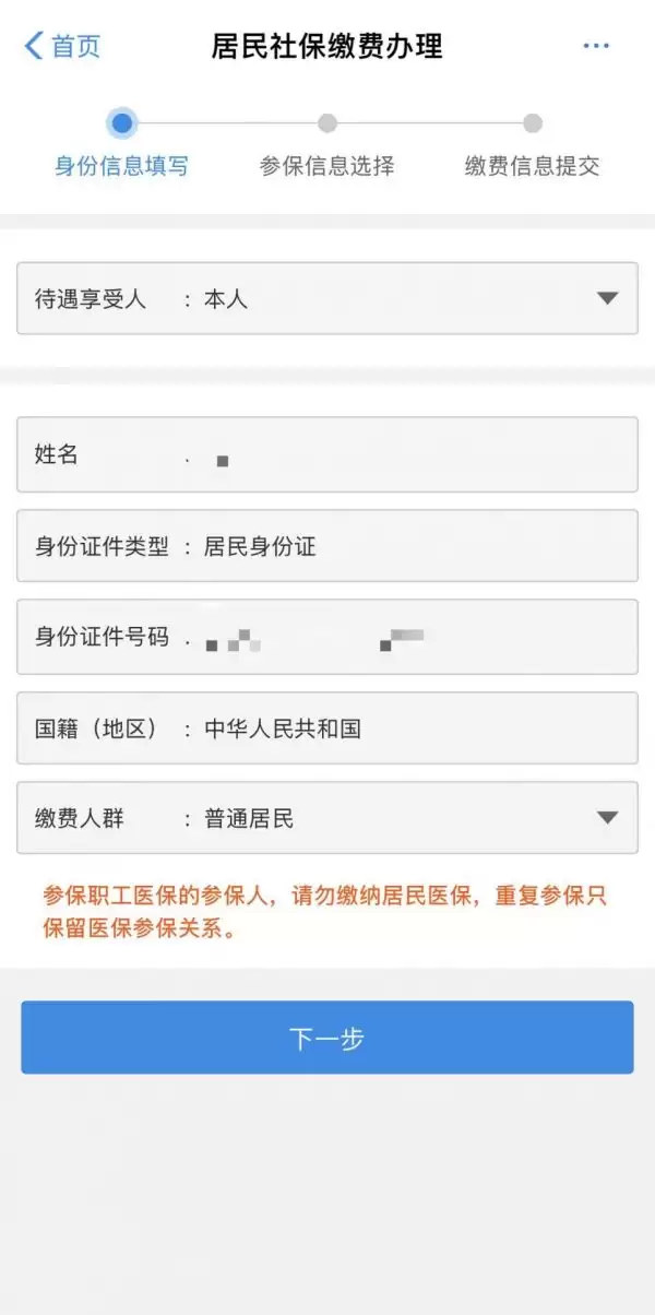 第三步:系统通常会根据你的登录信息自动填充姓名和身份证号,请核对无误后,直接点击页面下方的“下一步”按钮继续。
