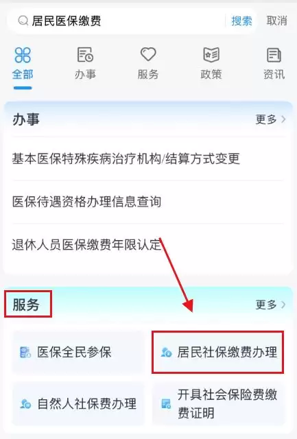 第二步:成功登录后,回到应用首页。在顶部的搜索框中输入“居民医保缴费”,从搜索结果里找到并点击“服务-居民社保缴费办理”这个选项。
