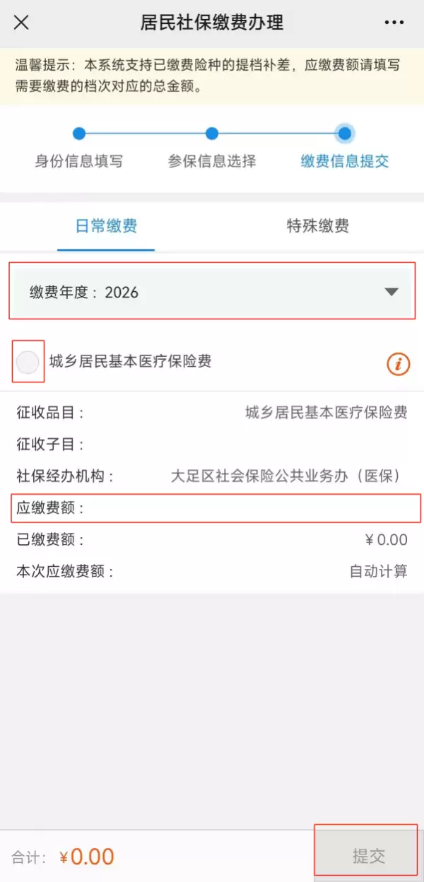 第五步:提交缴费信息并完成支付。请先选择缴费年度(例如2026年),然后根据个人情况选择合适的缴费档次,最后确认提交。