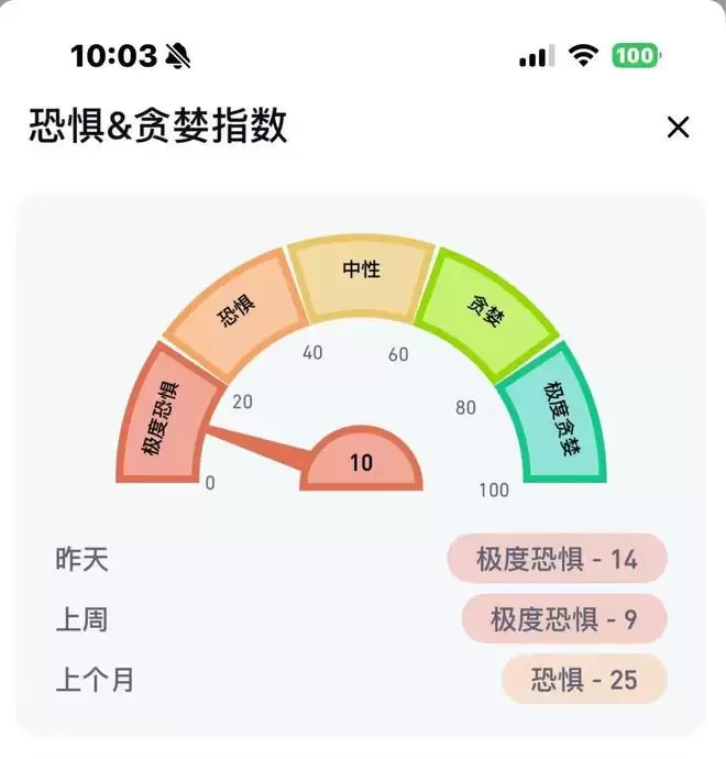 截至目前,市场恐惧指数仍为10,持续维持在极度恐惧水平,反映市场情绪尚未出现明显缓和。