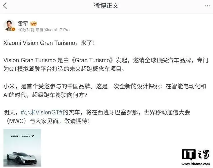 小米Vision GT超跑官图发布,2026年巴塞罗那MWC实车首秀