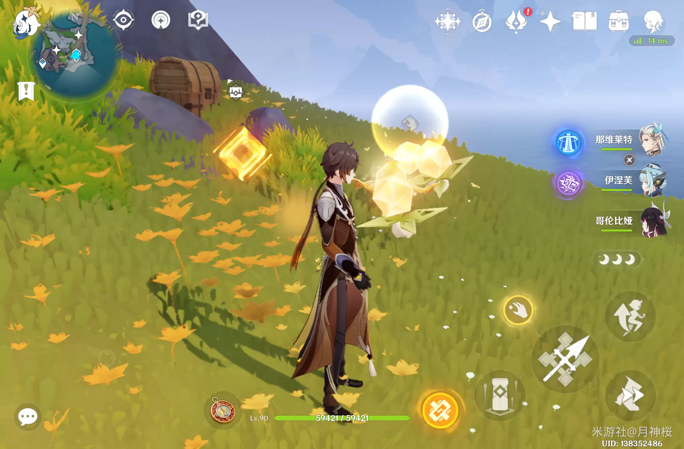 在神像脚下可以看到一株月距力植物,靠近时会出现小手标志,提示这个物品可以拾取