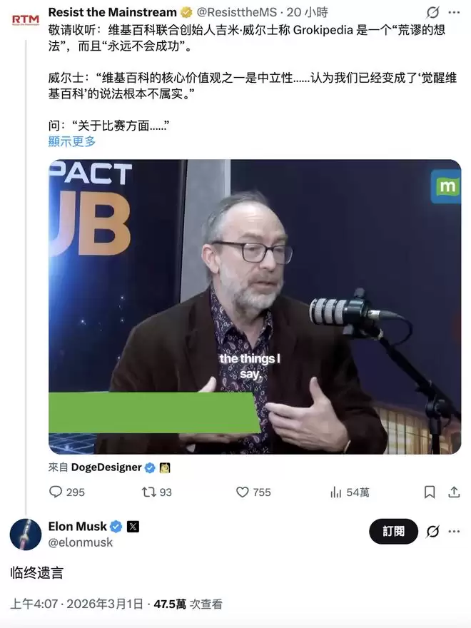 IT之家3月1日消息,维基百科联合创始人吉米·威尔士近日在接受采访时直言不讳地评价了马斯克推出的Grokipedia,称其不过是个“拙劣的模仿品”,既荒唐又注定失败。