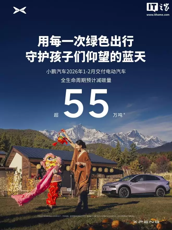 IT之家3月1日消息,小鹏汽车今日公布了最新交付成绩:2026年2月,该品牌共交付新车15,256台。2026年1-2月期间交付的车辆,相比传统燃油车型,在全生命周期内预计可减少约55万吨碳排放,相当于916万棵中等树苗十年间的固碳总量。