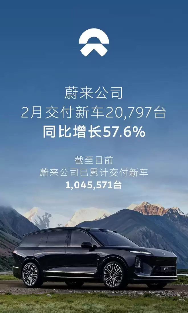 蔚来2月交付20797辆,同比增长57.6%创新高