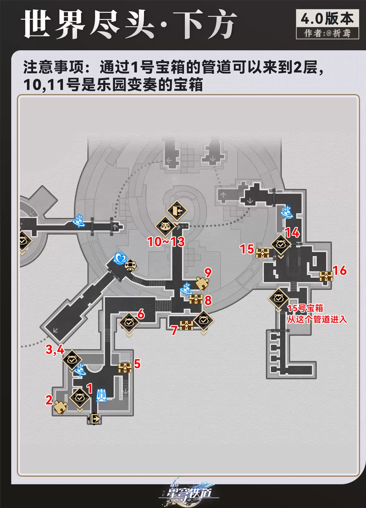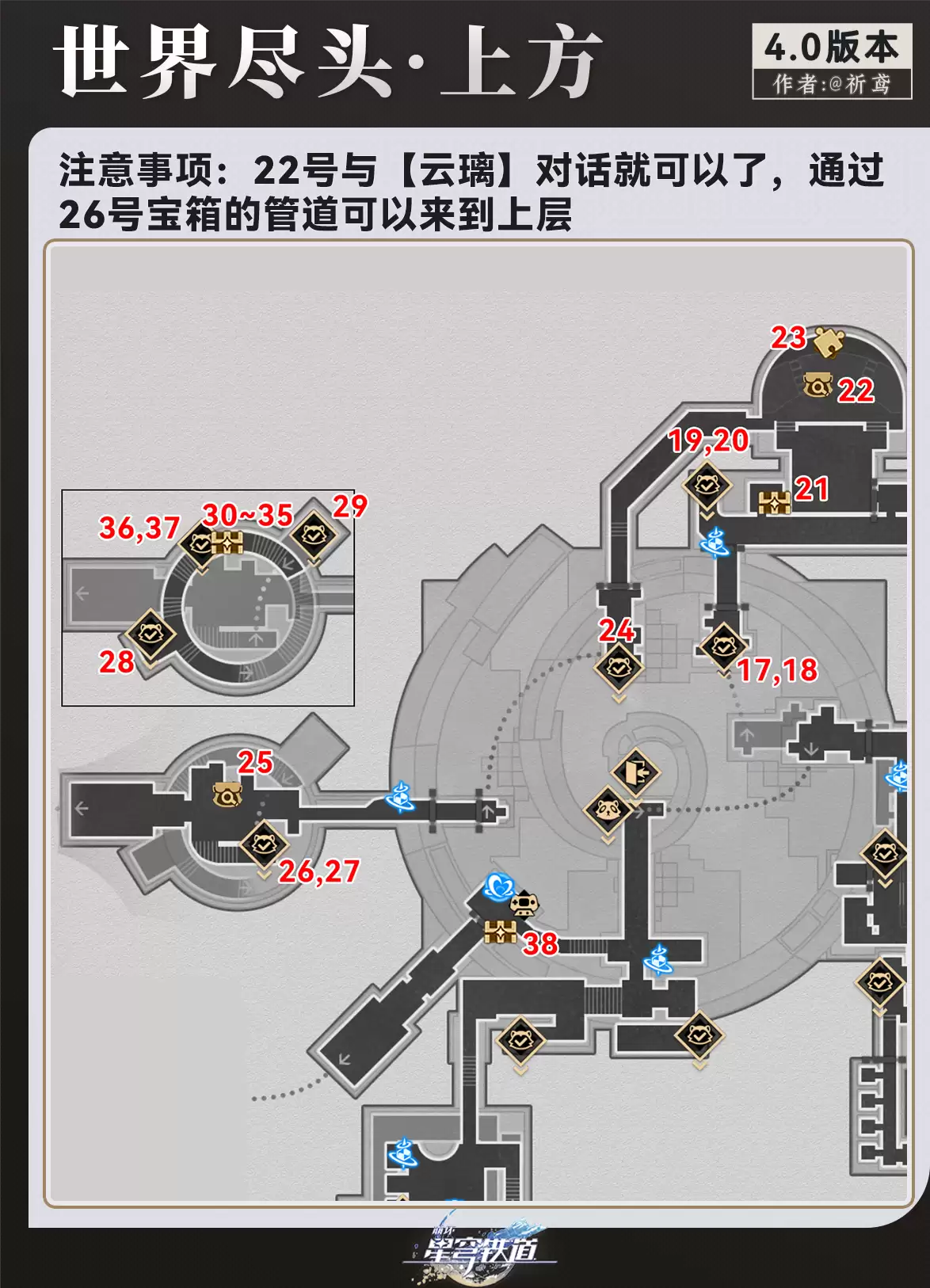 《崩坏:星穹铁道》世界尽头酒店地图的宝箱位置一览,下面为大家带来玩家“祈鸢ya”分享的二相乐园4.0版本——世界尽头·酒店地图的宝箱收集攻略,这张地图总共有29+7+2=38个宝箱,赶紧去收齐吧。