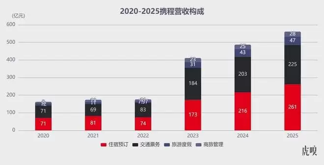 第一大板块住宿预订,2025 年营收 261 亿元,同比增长 21%,占总营收的 42%,是唯一跑赢整体营收增速的业务;