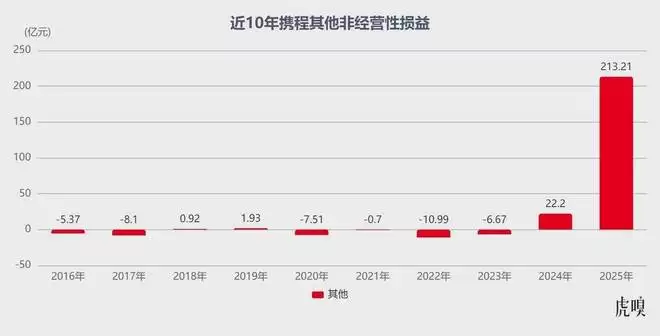财报显示,2025 年携程 332.94 亿元归母净利润中,“其他收入”达 213.21 亿元,同比飙涨 860%;其中,仅出售印度 OTA 平台 MakeMyTrip 部分股权就入账 170 亿元,而 2024 年全年“其他收入”仅为 22 亿元。