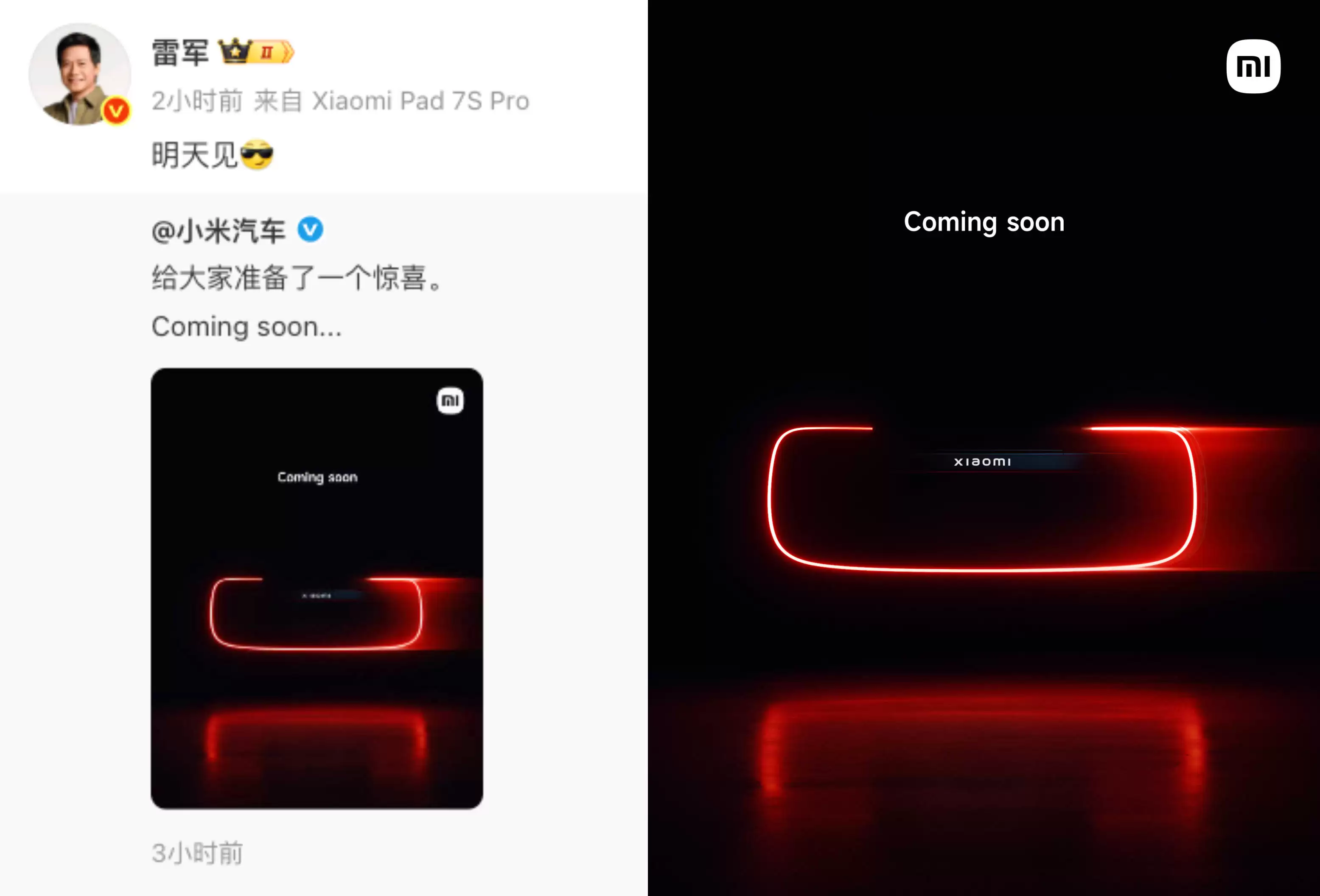 小米汽车近日突然释放重磅消息,其最新社交平台发布的新车预告海报引发全网热议。海报中仅展示了一组极具辨识度的弧形灯组与"xiaomi"标识,灯光紧贴地面的设计特征,暗示这可能是一款突破传统形态的低趴跑车。小米集团创始人雷军在评论区留言"明天见",进一步点燃市场期待。