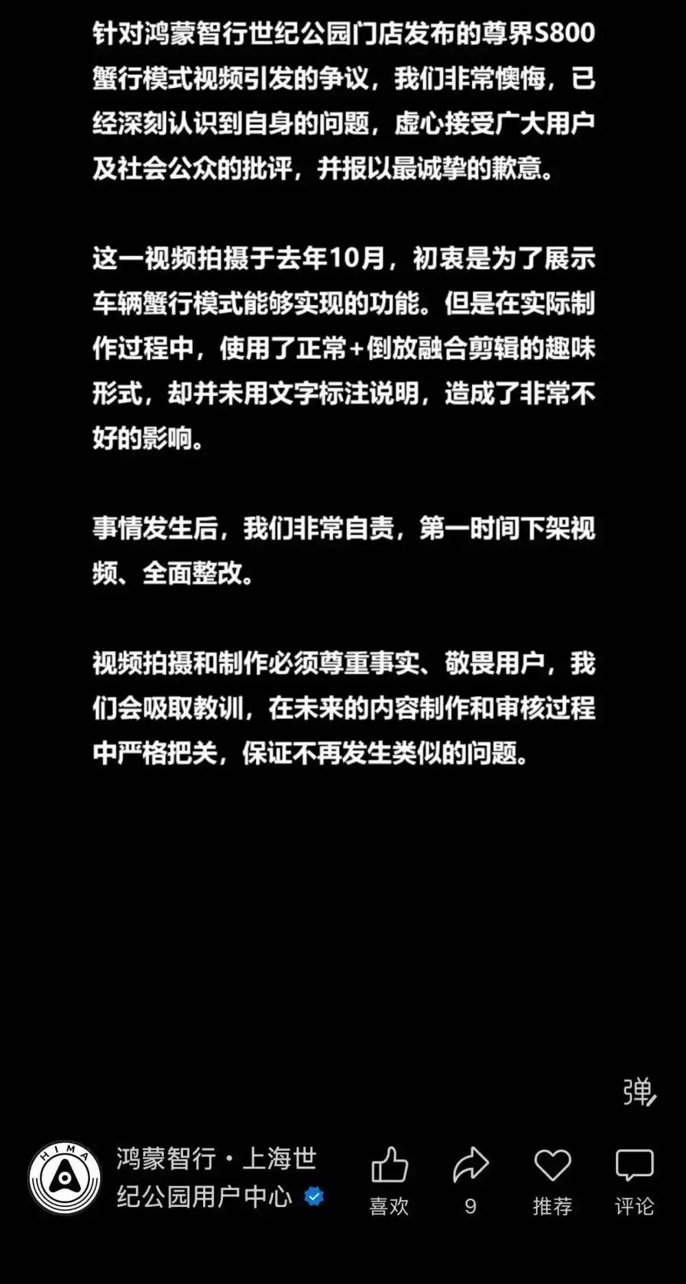 另一家"鸿蒙智行·上海世纪公园用户中心"则针对尊界S800蟹行模式视频致歉。声明说明该视频拍摄于去年10月,在实际制作中采用了正常播放与倒放融合剪辑的形式,同样未用文字标注说明。门店表示已在第一时间下架视频并进行整改。