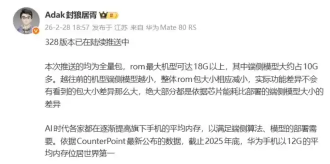 另外据博主透露,328版本推送的均为全量包,ROM最大机型可达18GB以上,其中端侧模型大约占10GB多。