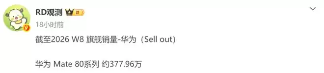 近期的华为手机迎来了两个好消息,分别是截至2026年第8周,华为Mate 80系列累计销量已达377.96万台,距离400万大关仅一步之遥。