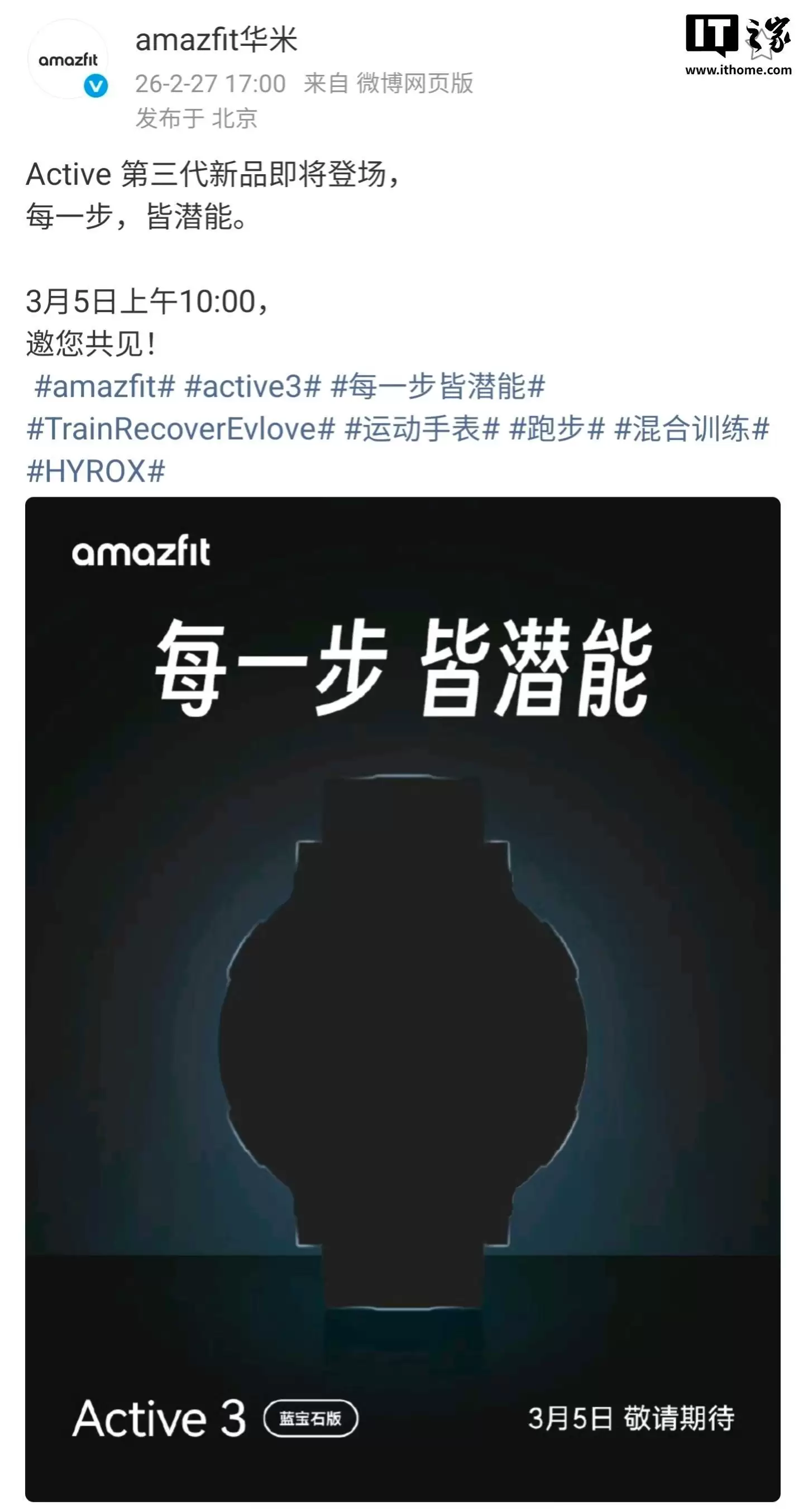 IT之家 2 月 28 日消息,华米昨日官宣 Amazfit Active 3 将在 3 月 5 日发布,宣传语为“每一步,皆潜能。”IT之家注意到,Amazfit Active 3 Premium