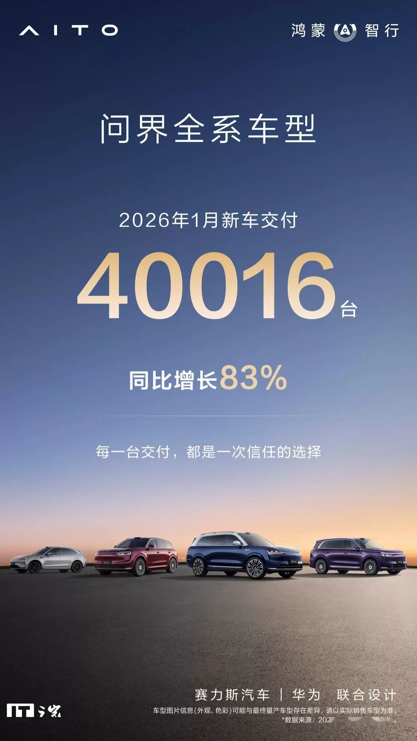 具体交付数据显示,问界品牌1月单月交付量达40016辆,同比增幅高达83%。结合前两个月总交付量计算,2月交付量约为1.8万辆。这一数据印证了鸿蒙智行在高端新能源市场的强劲竞争力,其产品矩阵正持续获得消费者认可。