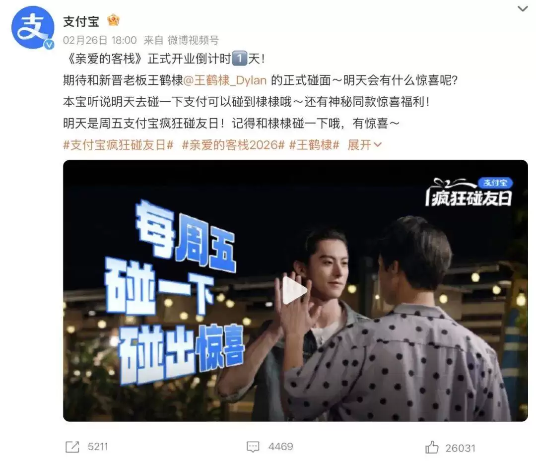 先是阿里系头牌产品支付宝独家冠名,就很活久见,反正印象里没见过它冠过综艺。直到看了26日支付宝官微很给牌面的单独发博,犀牛君恍然大悟,支付宝最近力推的碰一碰支付跟客栈综艺前台场景适配度也太高了吧,“本宝听说明天去碰一碰支付可以碰到棣棣哦”这广告语简直是精准打击好吗!
