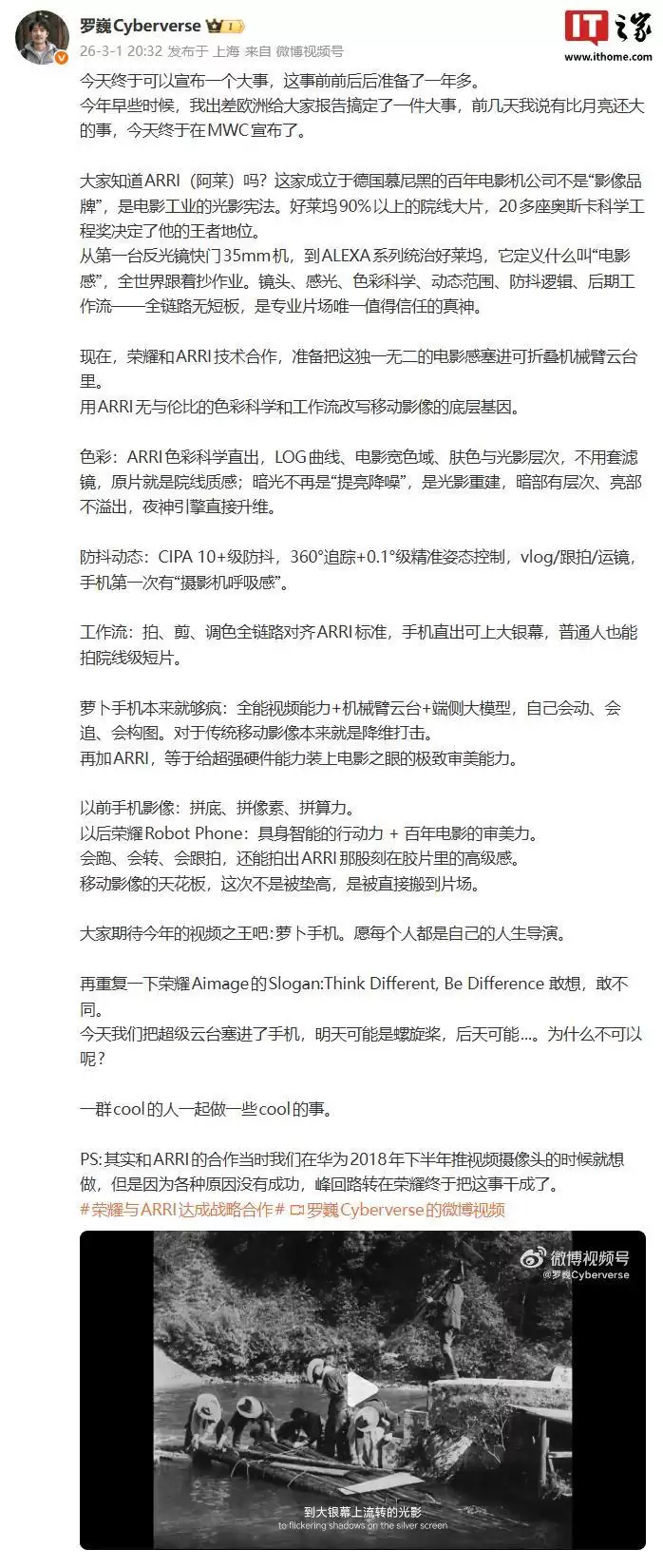 今天,终于可以宣布一件大事,这件事前前后后准备了一年多。今年早些时候,我去欧洲出差,为大家带回了一个重磅消息。前几天我说有比月亮还大的事,今天终于在MWC上正式公布了。大家知道ARRI吗?这家总部位于德国慕尼黑的百年电影机公司,它并非普通的“影像品牌”,而是电影工业的光影宪法。好莱坞超过90%的院线大片,以及二十多座奥斯卡科学技术奖,奠定了它的王者地位。从第一台反光镜快门的35毫米摄影机,到ALEXA系列,它定义了什么是真正的“电影感”,全世界都在追随它的作业。镜头、感光、色彩科学、动态范围、防抖逻辑、后期工作流——全链路无短板,是专业片场唯一值得信赖的真神。现在,荣耀和ARRI的技术合作,准备把这独一无二的电影感塞进可折叠机械臂云台里。用ARRI无与伦比的色彩科学和工作流,改写移动影像的底层基因。在色彩方面:直接运用ARRI色彩科学,LOG曲线、电影级宽色域、肤色与光影层次,无需套用滤镜,原片直出就是院线质感;暗光拍摄不再是简单地“提亮降噪”,而是光影的重建,暗部有细节、亮部不溢出,夜神引擎直接实现维度提升。在防抖与动态捕捉方面:达到CIPA 10+级防抖标准,支持360°全方位追踪与0.1°级精准姿态控制,无论是Vlog拍摄、智能跟拍还是复杂运镜,手机第一次拥有了“摄影机般的呼吸感”。在工作流方面:拍摄、剪辑、调色全链路对齐ARRI专业标准,手机直出的素材即可上大银幕,普通人也能轻松创作院线级的短片。Robot Phone本身就足够颠覆:全能视频能力 + 机械臂云台 + 端侧大模型,自己能运动、会追踪、懂构图。这对传统移动影像已经是降维打击。再加上ARRI的加持,等于为超强硬件能力装上了一双电影之眼的极致审美能力。以前的手机影像:拼传感器、拼像素、拼算力。以后的荣耀Robot Phone:具备智能的行动力 + 百年电影的审美力。会跑、会转、会跟拍,还能拍出ARRI那种刻在胶片里的高级感。移动影像的天花板,这次不是被垫高,而是被直接搬到了片场。期待今年的视频之王吧:Robot Phone。愿每个人都能成为自己人生的导演。再次重复一下荣耀Aimage的Slogan:Think Different,Be Difference。敢想,敢不同。今天我们把超级云台塞进了手机,明天可能是螺旋桨,后天或许……为什么不呢?一群酷的人,一起做些酷的事。PS:其实与ARRI的合作,早在2018年下半年我们在华为推动视频摄像头时就想推进,但受限于各种条件未能成功。如今峰回路转,终于在荣耀把这件事干成了。