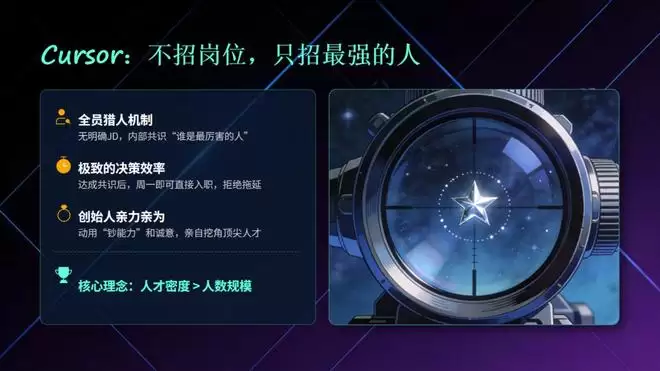 Cursor的经验是:在找到前50个“特种兵”之前,不要急着搭建庞大的中层架构。宁缺毋滥,是AI时代的第一招聘法则。