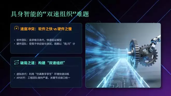 冲突:算法团队希望每天迭代模型,但硬件团队受限于供应链和实地测试,周期以“周/月”计。解法:成功的公司正在构建“双速组织”。软件团队保持Cursor式的敏捷,利用“仿真数字孪生”(通过数字技术构建与物理实体一致的虚拟模型,用于模拟测试、迭代优化)在虚拟环境中进行百万级次训练;工程团队保持传统严谨,但在关键节点通过API与软件团队对齐。
