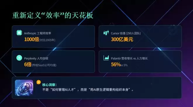 Anthropic的工程师,按核心功能迭代速度、代码产出质量综合测算,效率被前谷歌高管证实比2005年同行高1000倍——尽管2005年与2026年的技术环境、开发工具差异巨大,但这个量级的差距依然足以引发深思;Cursor用不到两年时间,靠250人(其中约50位有过创始人经历)撑起了2026年2月最新估值近300亿美元,ARR已突破1亿美元;Perplexity以247人的精简团队,实现了140亿美元估值,人均创收是传统SaaS的6倍;Palantir在营收增长56%的同时,人力仅增加了5%。