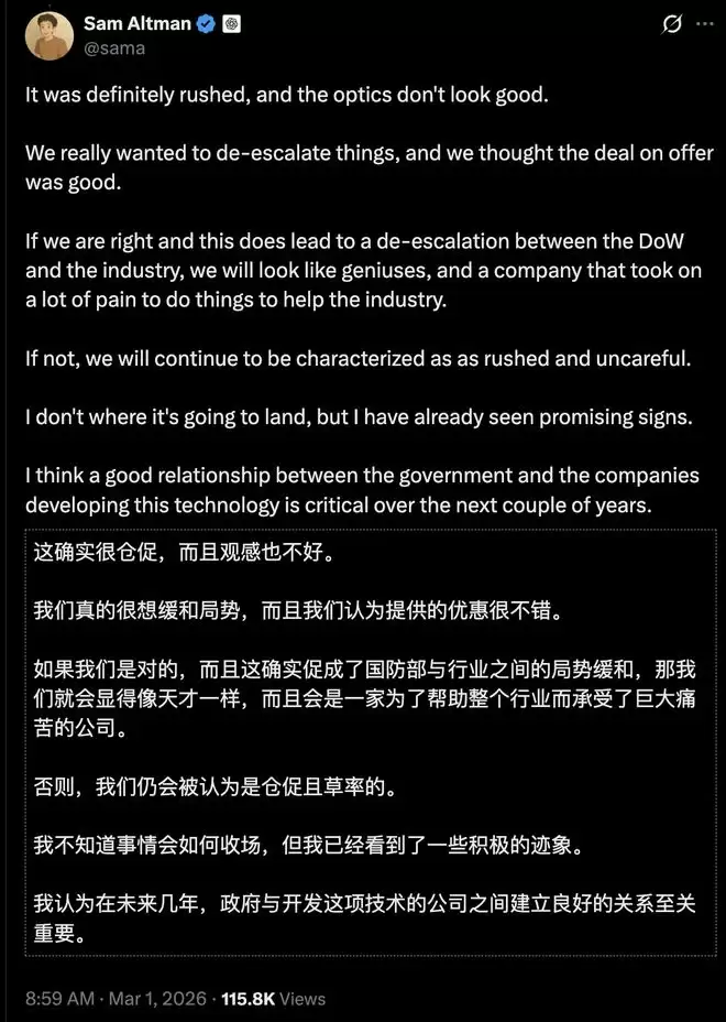 (OpenAI与美国国防部的交易金额)也就几百万美元,与我们200多亿美元的年收入相比微不足道,绝对不值得为此引发公关风波。
