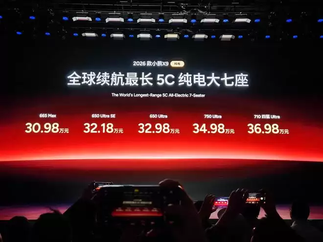 在发布会最后,何小鹏发布了2026款小鹏X9纯电版,新车共推出五个版本,售价区间为30.98万元-36.98万元,同时还增加32.18万元的2026款小鹏X9超级增程1602 Ultra SE版。