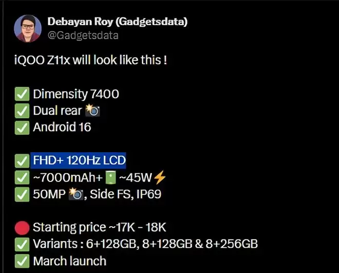 海外版预告显示iQOO Z11x在印度售价将低于23000卢比,约合人民币1900元,起售价可能在17000-18000卢比之间(约1400-1500元)。
