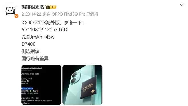 而核心配置方面海外版和国内版本还是会有一些差异化,海外版(印度等市场)确认搭载联发科天玑7400 Turbo处理器,性能定位中端,日常使用和轻度游戏完全够用。