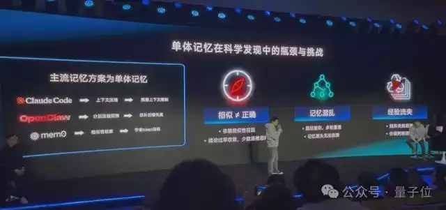 因此,沈砾捷精准总结出了单体记忆的三大核心挑战:信息回溯依赖相似性而非正确性,迭代中记忆覆盖造成源头丢失,错误经验直接抛弃引发知识流失。